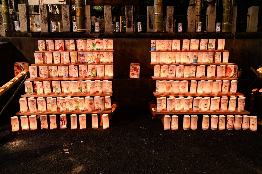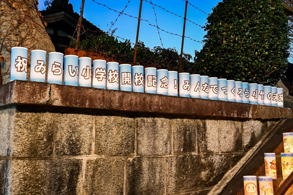 イベントのハイライトの一つは、小竹みらい小学校の児童たちが心を込めて絵付けした手作りの竹灯籠です。