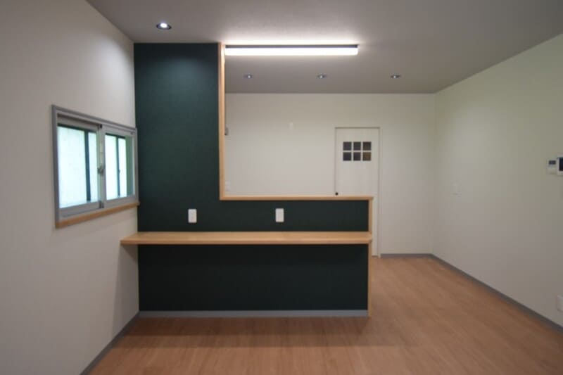 レンジフード部分の壁とキッチンの腰壁はLDK入口のドアに合わせたグリーンのアクセントクロスです。