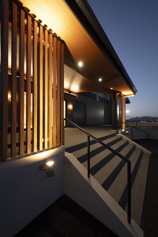 玄関のアクセントとして、木目調のルーバーを設置しました。